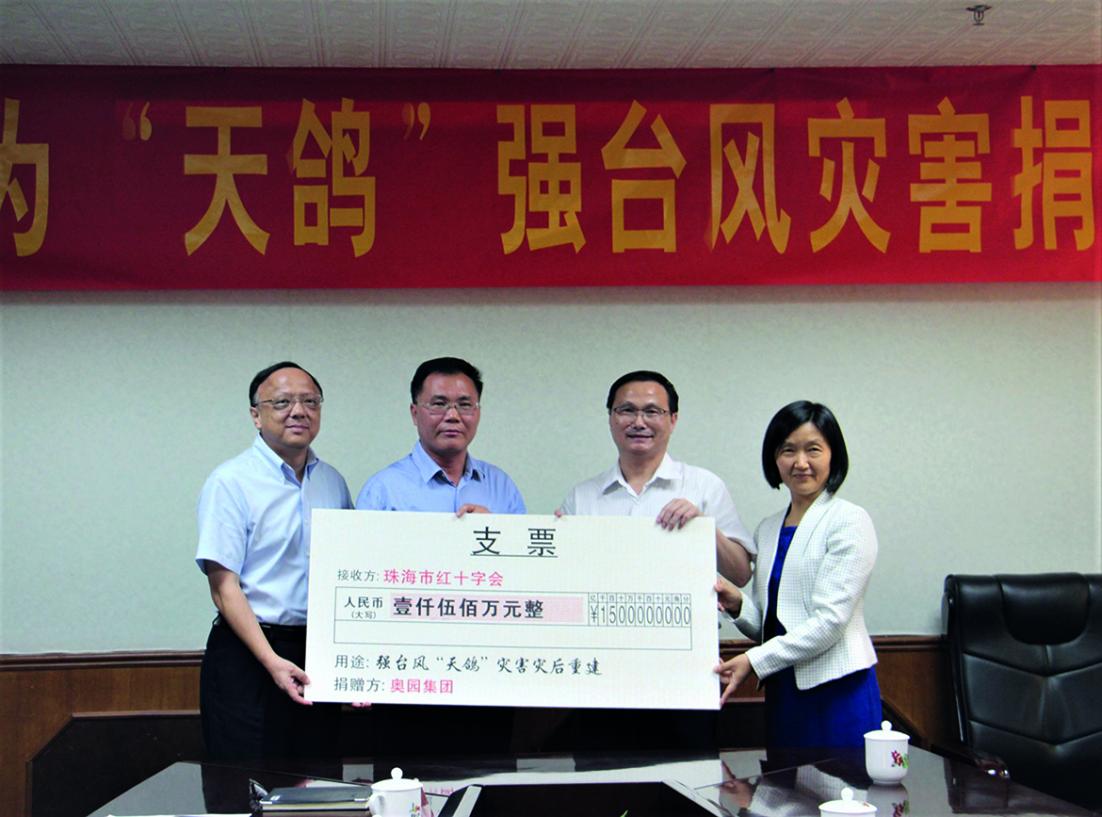 2017年,中國奧園為珠海“天鴿”強臺風災后重建捐贈1500萬元