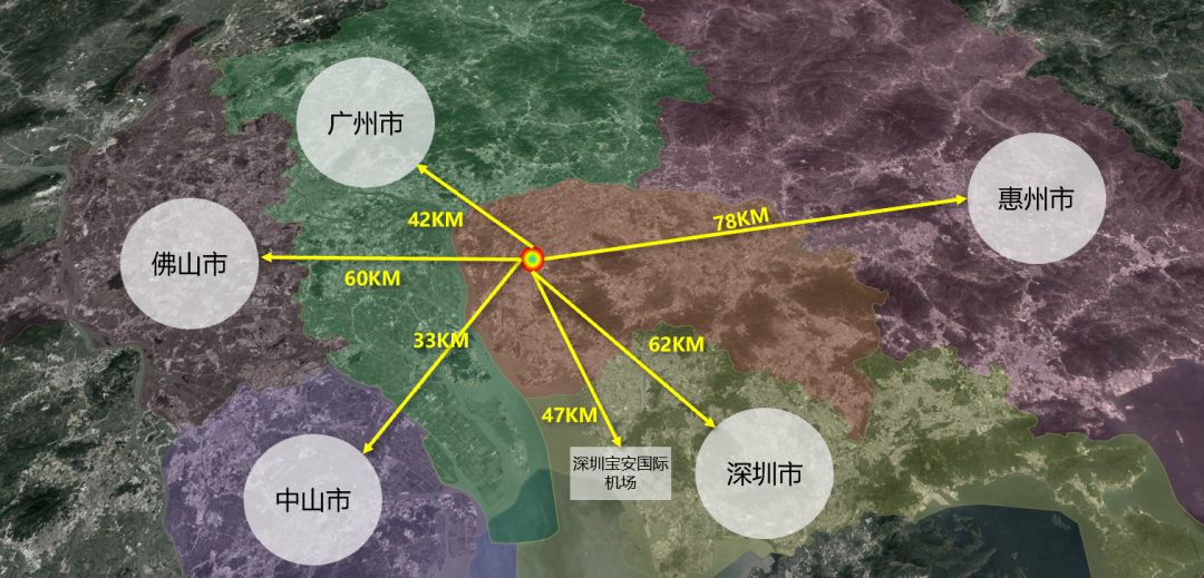 距離廣州、深圳、佛山、中山、惠州城區均僅1小時左右車程,成為大灣區交通及產業資源的必經之地。