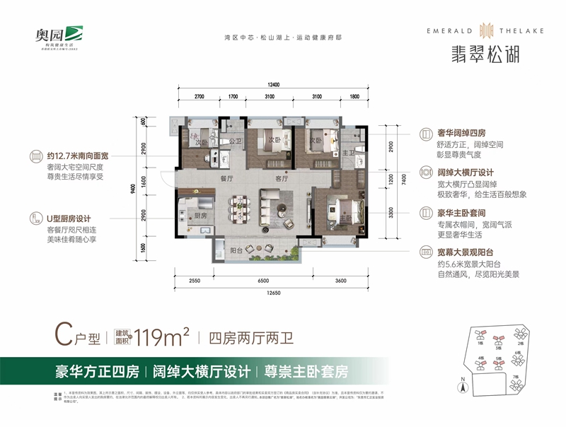 為滿足客戶暢享全景四季鮮氧生活需求,翡翠松湖在戶型上極力打造寬幕尺度。其中,建面119㎡的4房2廳2衛,擁有約12.7米南向面寬,約7米寬境大橫廳,讓業主無論是居家還是接待客人均顯氣派。另外,該戶型約5.6米寬境陽臺與客廳相連貫通,盡享無界景觀視野。太太的瑜伽,孩子的露營帳篷,父母的花草,生活點滴輕松容納。
