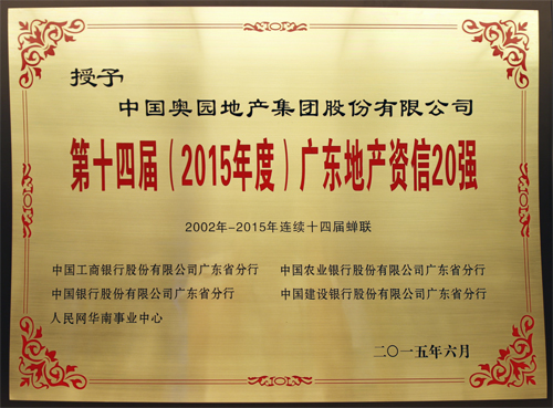 奧園秉承“高效、誠信、責任”的企業精神,2014年有效去杠桿化,凈負債比率同比下降2.2%,處于業內中低水平;現金回款率保持在81%的較高水平。憑借一直以來良好的企業信譽,穩健的財務狀況,奧園連續14年蟬聯“廣東地產資信20強”,得到了社會各界、國內外投資者及各大金融機構的青睞和大力支持?!皬V東地產資信20強”榮譽是對我司多年綜合實力和企業信譽一個肯定,持續的優良資信將為奧園集團繼續穩健快速發展奠定堅實基礎。