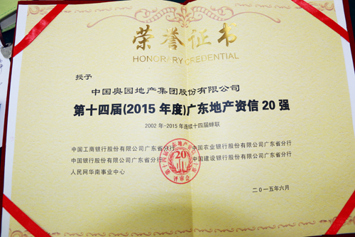 “第十四屆(2015年度)廣東地產資信20強”獎狀