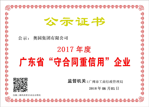 (2018年6月1日——廣州)6月1日,奧園旗下奧買家集團首次榮獲廣東省工商行政管理局“廣東省守合同重信用企...