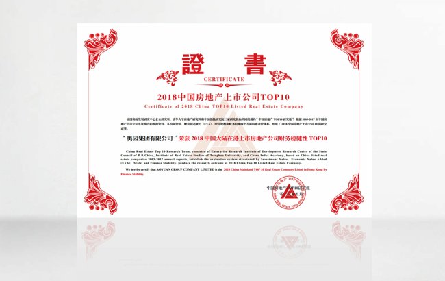 再獲殊榮!奧園榮獲“2018中國大陸在港上市房地產公司財務穩健性TOP10”等多個獎項
