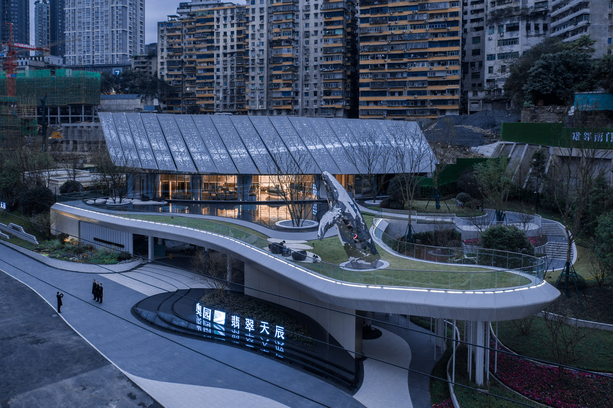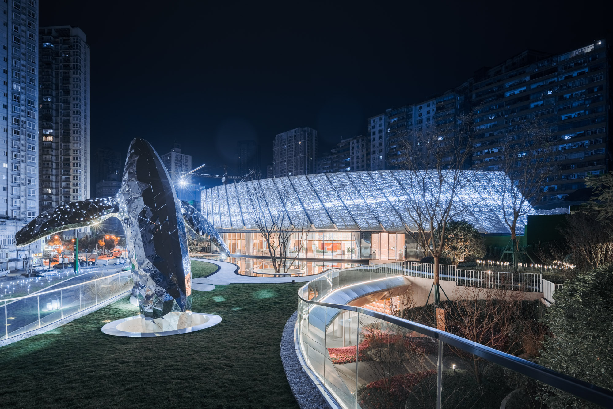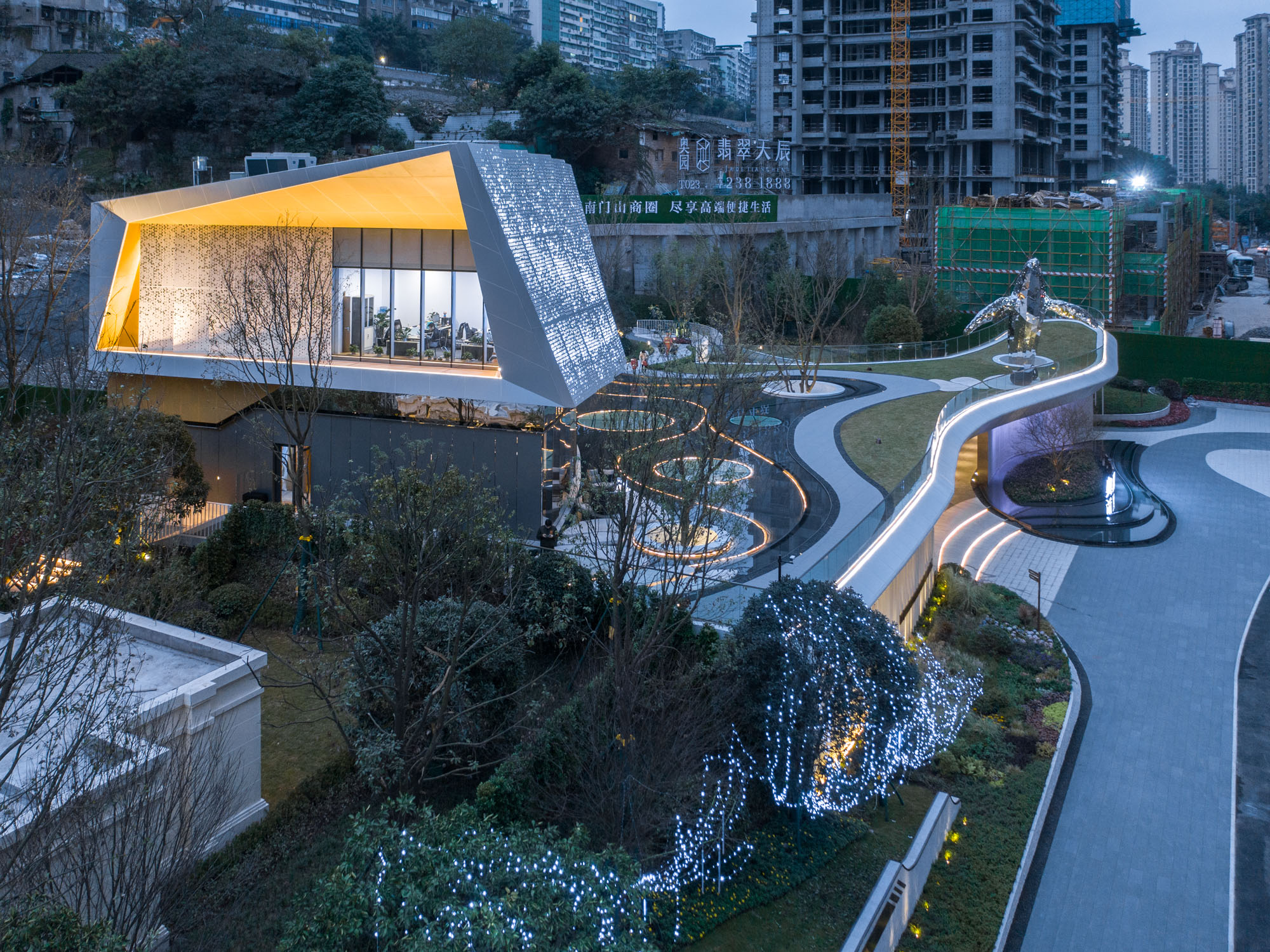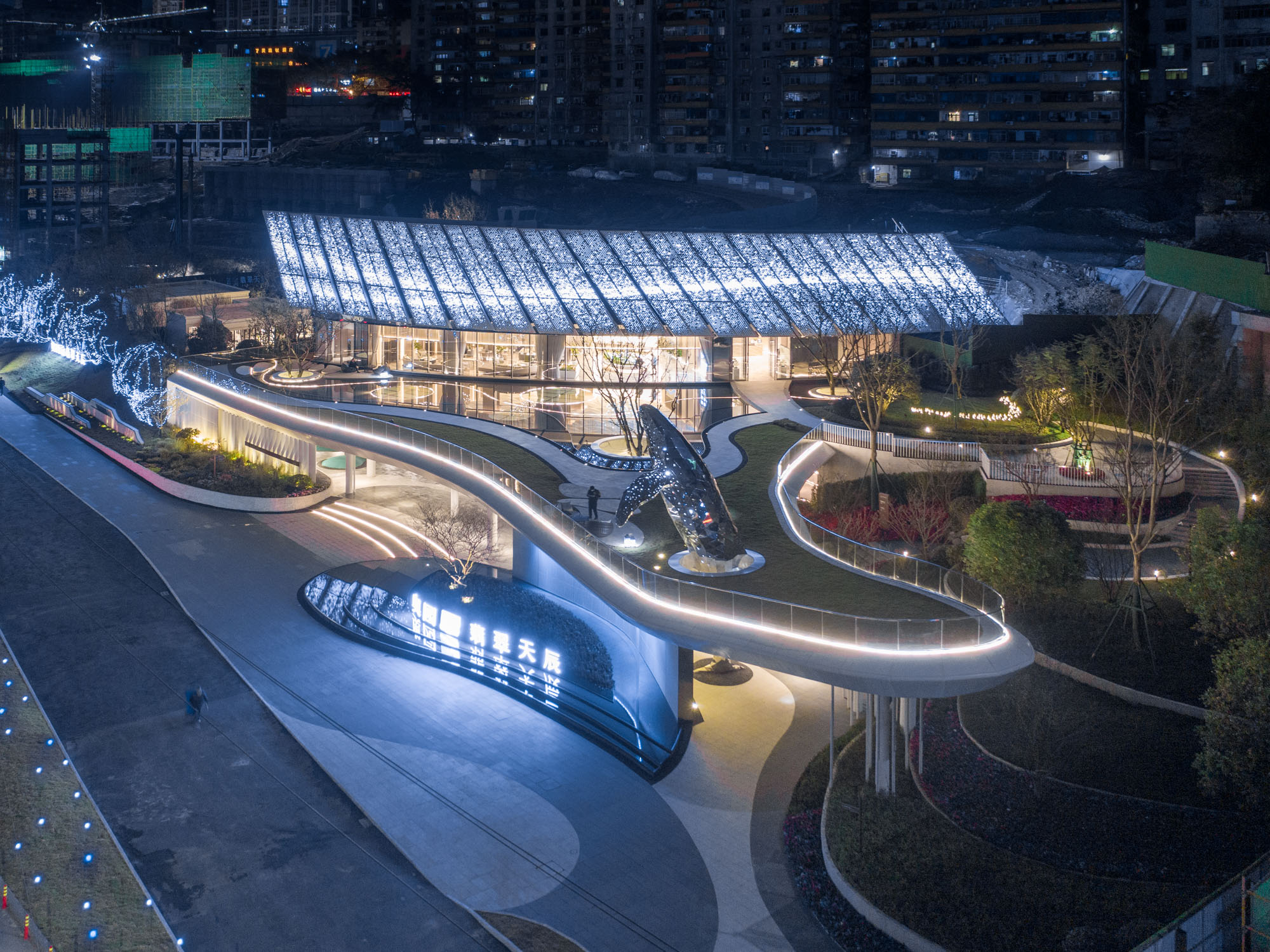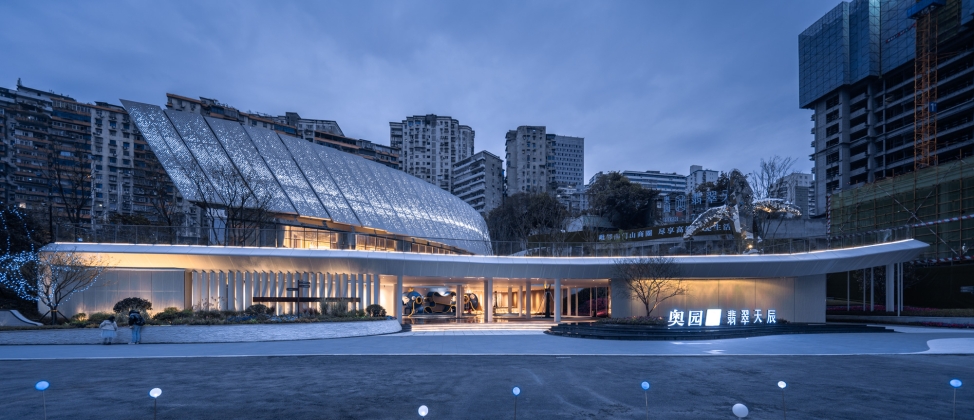 應“石魚出水兆豐年”之說,奧園·翡翠天辰示范區與長江中的白鶴梁水下博物館比鄰而居。項目設計以此為切入點,從白鶴梁題刻中一尾標注最早、枯水題刻的石魚中汲取設計靈感。示范區內,建筑以星河長帆為魂,景觀以大魚雕塑為魄,以江岸線為骨架,以山林為底色,建筑與景觀交融為一體,打造涪陵IP新地標——“漂浮的水岸藝術生活館”。在涪陵依山望水之地,勾勒出了“一舟一帆”兩道優美交織的弧線。舒展的長帆劃過天空,留下了與萬家燈火遙相呼應的璀璨銀河。示范區以“迎- 享- 探- 觀- 賞”的游覽動線,開啟有方向性的、充滿好奇心的探索,讓來賓踏上一場愜意的體驗之旅。